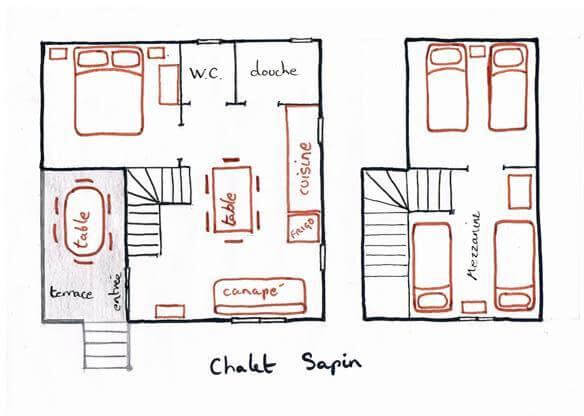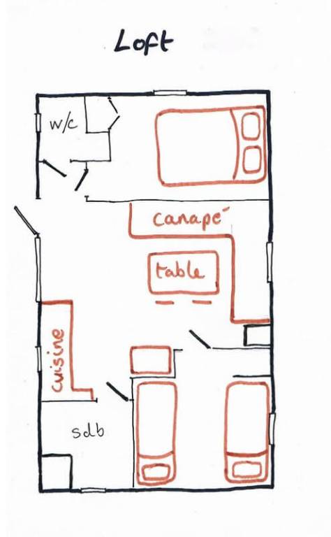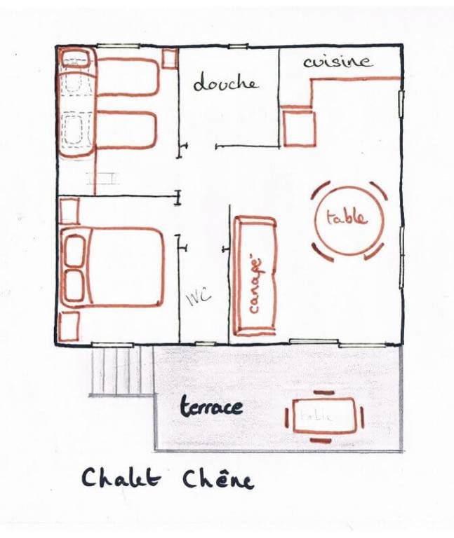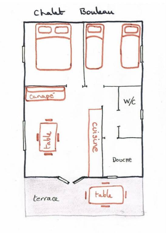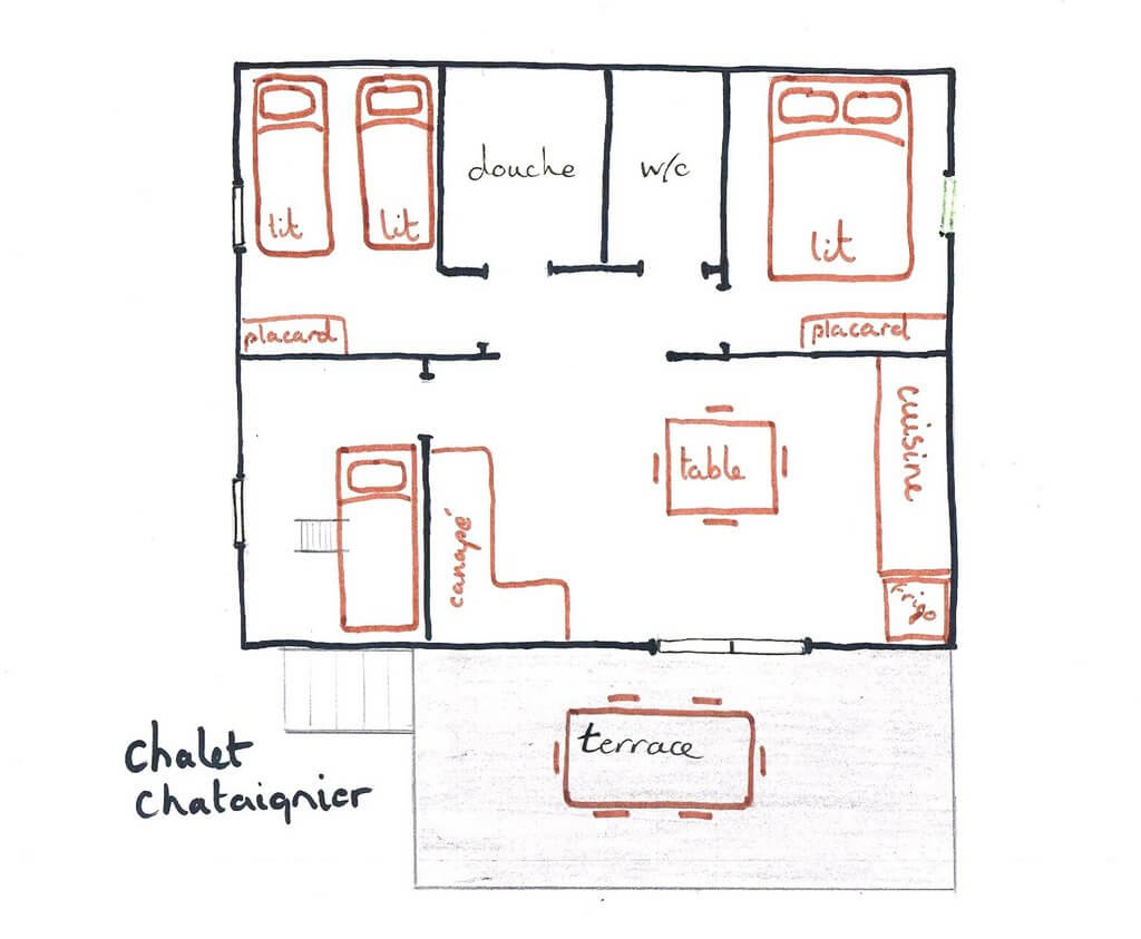 REZ-de-CHAUSSEE: 1 chambre (3 lits simples 90x190cm) avec douche et toilettes privatifs.