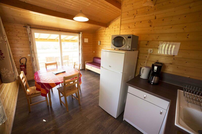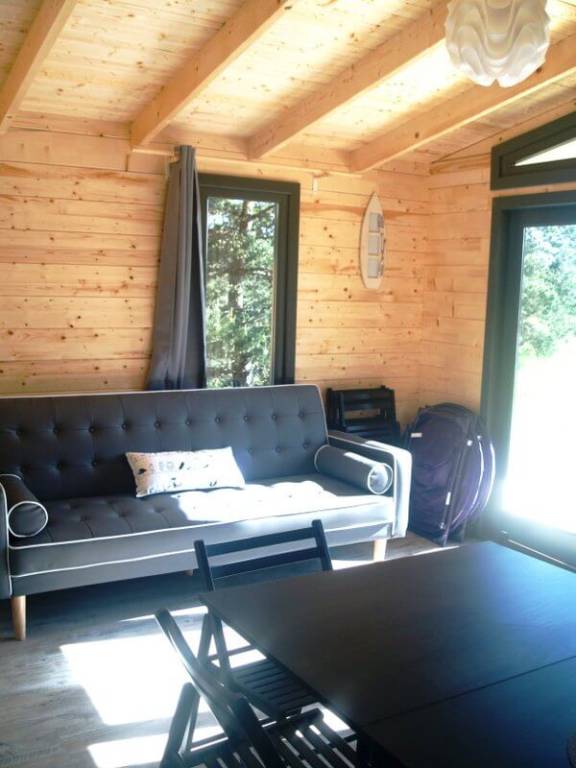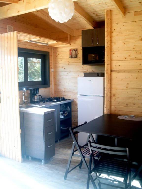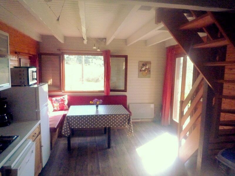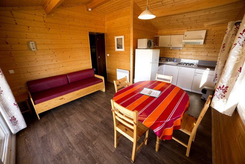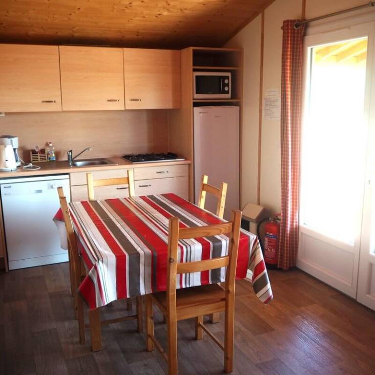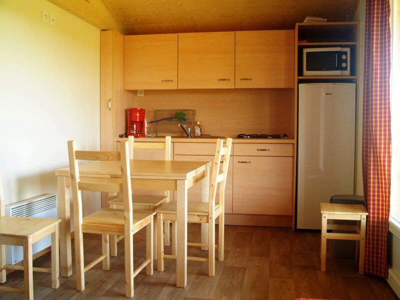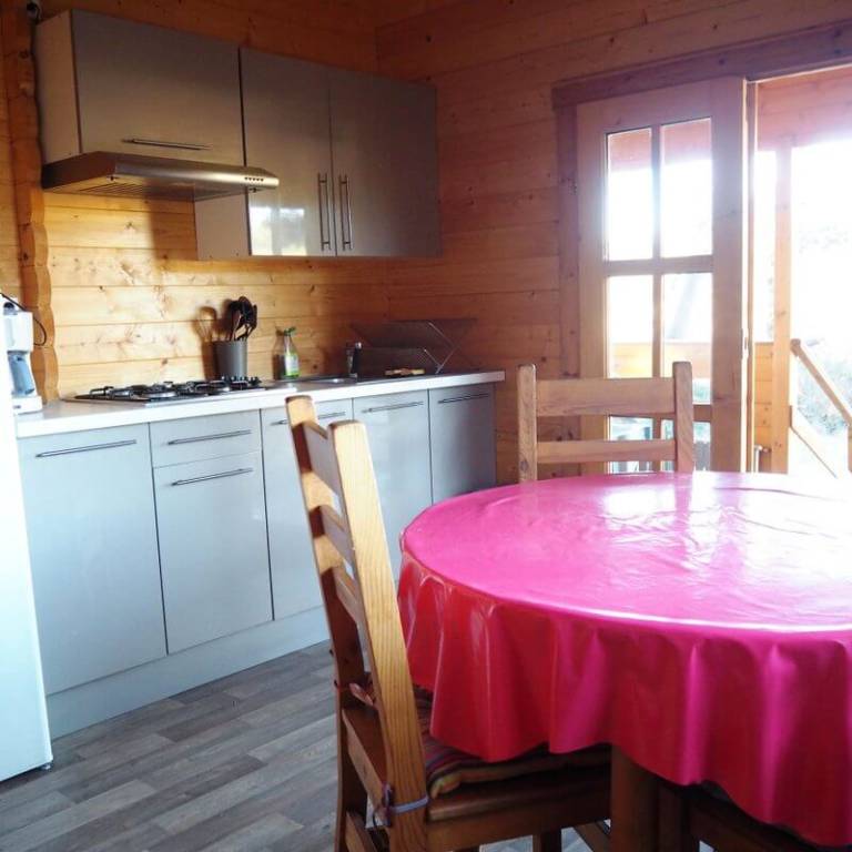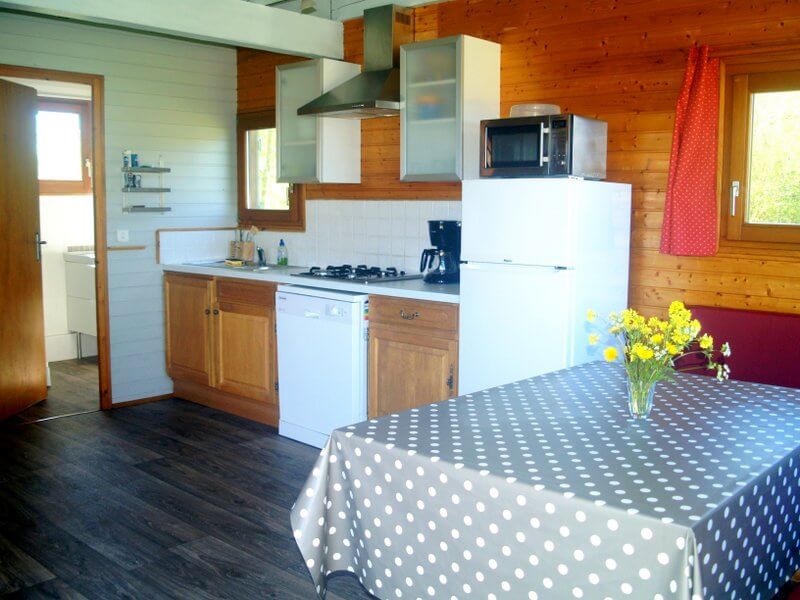 Chaque gîte a un salon-cuisine avec table, chaises, canapé et poêle à bois.