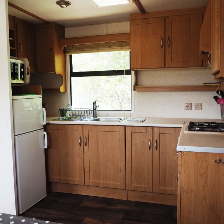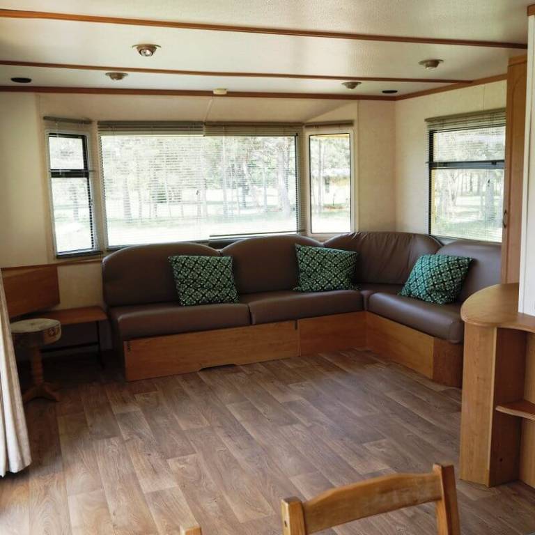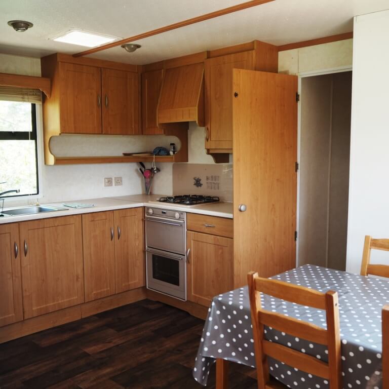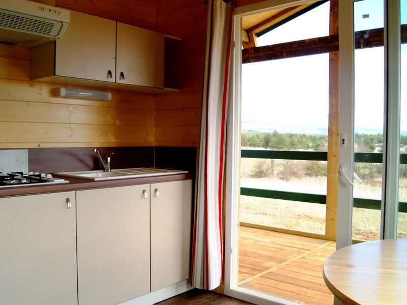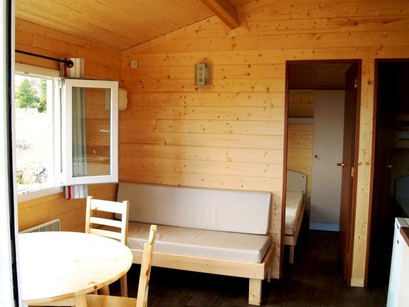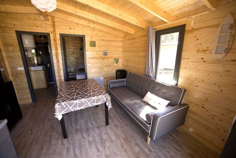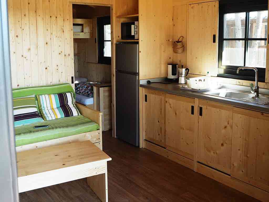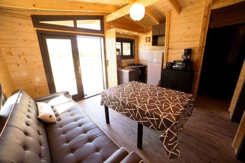 Chaque gîte a un salon-cuisine avec table, chaises, canapé et poêle à bois.