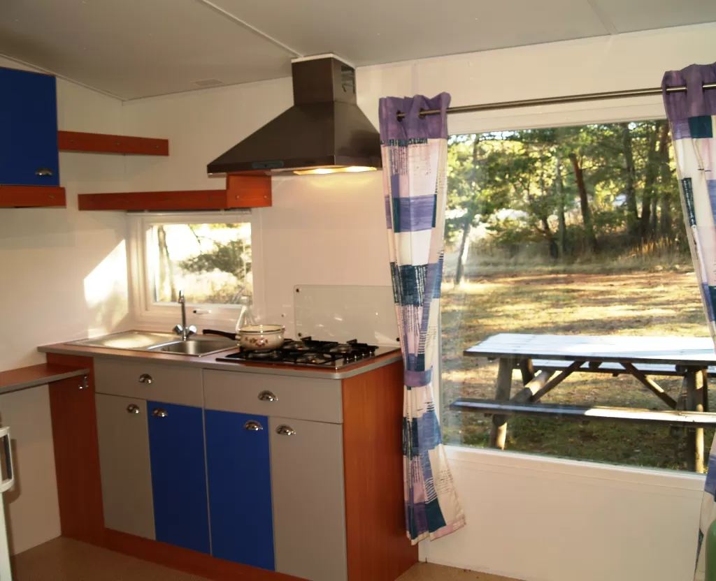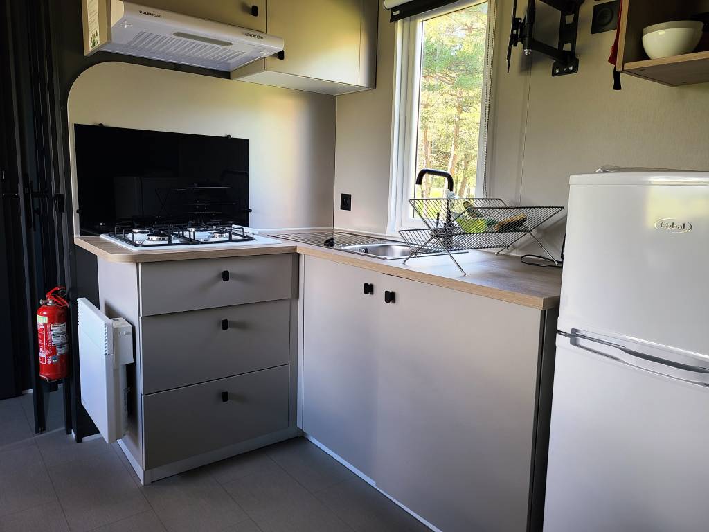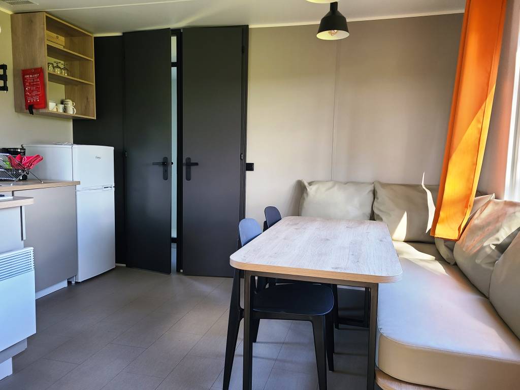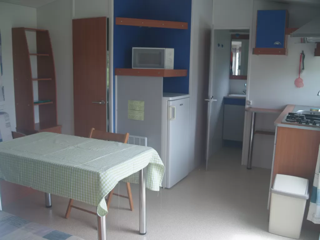 Salon avec canapé, fauteuils, poêle à bois, table et chaises; espace cuisine avec plaques électriques 4-feux, réfrigérateur, lave-vaisselle, micro-onde, petit four, cafetière filtre, vaisselle